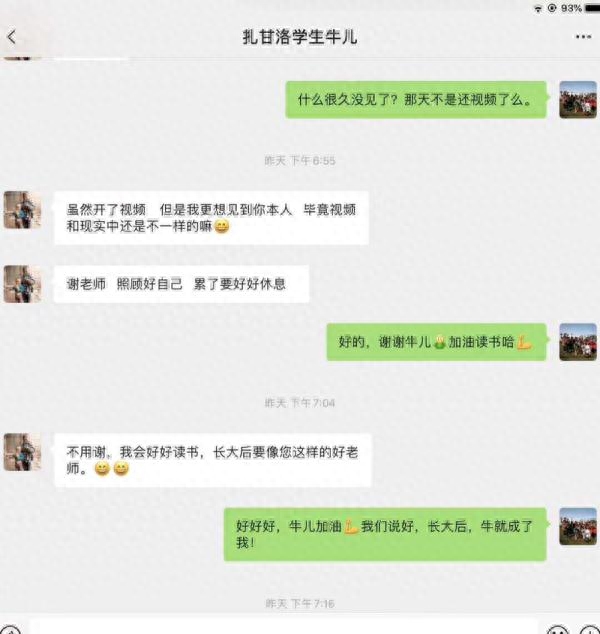 图为谢彬蓉与扎甘洛村的学生通过微信在聊天互动。