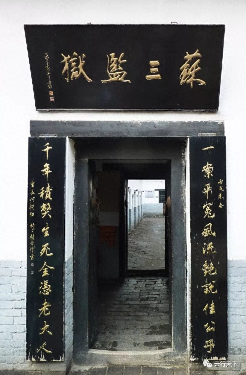 苏三监狱俗称“虎头牢”,是苏三遗迹的重要组成部分。 相传是明朝初期的建筑。洪洞县旧事的县衙大堂,也被称为“苏三供堂”,大堂右角有一拱形门,便是监门。进入监门,穿过五道小门,便进入一条狭窄的胡同,这胡同一米多宽,两边是两排牢房,门洞低矮,豆腐块似的窗口,被几根粗粗的窗棂所揽,只留下几条细缝,牢内阴暗潮湿。胡同壁滑无攀,顶部还盖着铁网,可谓名副其实的天罗地网。走到胡同尽头,往东拐弯儿,迎面墙上有一个面目狰狞的虎头。下面有一个小门,形似虎门,这就是虎头牢。