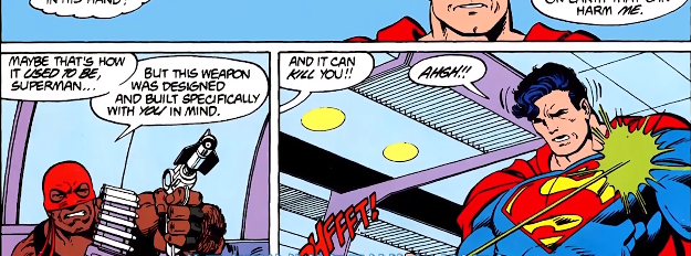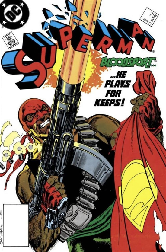 超人几乎是站在DC宇宙战力之巅的男人,想干掉超人谈何容易,强如佐德将军、毁灭日都无法抹杀超人,更别说十八线的血腥运动,漫画中大反派卢瑟给杜波伊斯提供了稳居世界前沿的武器装备,其中就包括一把氪石枪。血腥运动人如其名,在街道上他便大开杀戒对着无辜群众开火意图引出超人。他认为自己和弟弟用生命捍卫普通大众的自由,但是大众却浪费掉这来之不易的自由,他指责大众软弱无能自私自利,其实从这里就能看出血腥运动此时的精神状态极度不稳定——因为他根本就没有上战场,他落跑了,他恨无辜群众的同时更恨软弱的自己,恨自己一手造成了弟弟的悲剧。
