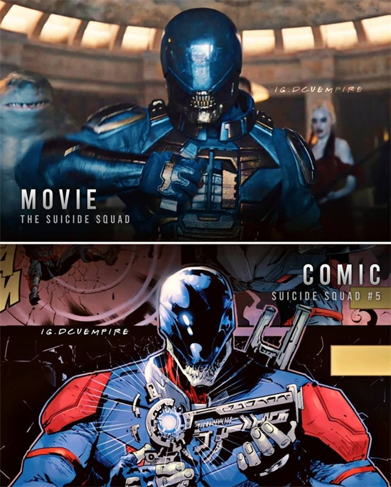 而在联动电影的漫画中,血腥运动的起源故事作了稍稍改动。例如弟弟不是重度残疾而是战死,至于说行走的军火库,血腥运动自己解释卢瑟赋予了他空间传送的装备,加入自杀小队后阿曼达会提供无穷无尽的军火来支撑自己的战斗。
