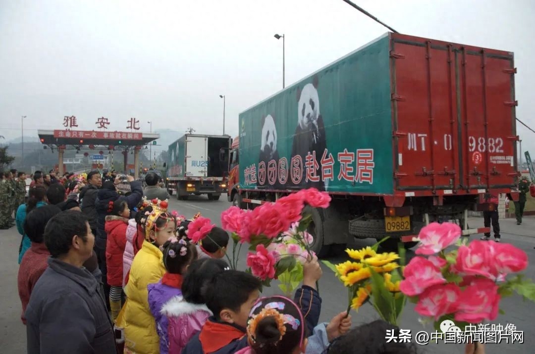 2008年12月23日,赠台大熊猫“团团”“圆圆”在四川省雅安市市民欢送中,前往成都双流机场,转乘专机飞赴台北市动物园定居。(张国军 摄)