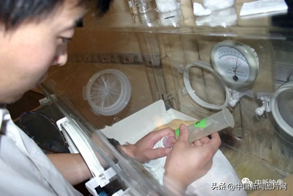 2011年2月9日,大陆赠台大熊猫“团团”“圆圆”首次在台北市立动物园进行人工受精。图为兽医师等专业人员为“团团”人工取精。(台北市立动物园 供图)