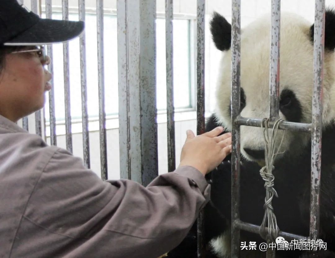 2008年,饲养员通过安抚、“耳语”等方式安抚在地震中受惊的大熊猫“团团”。(任晨鸣 摄)