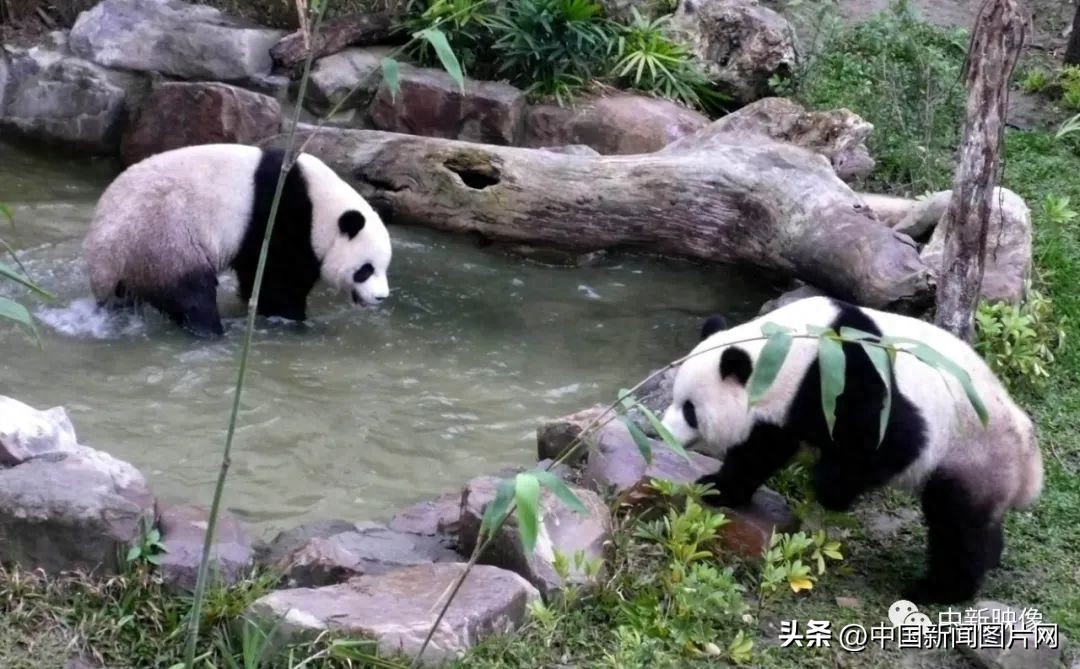 2009年2月14日,大陆赠台大熊猫首次在台北新家的户外展示场与游客见面。图为“团团”“圆圆”在水池内戏水玩耍。(路梅 摄)