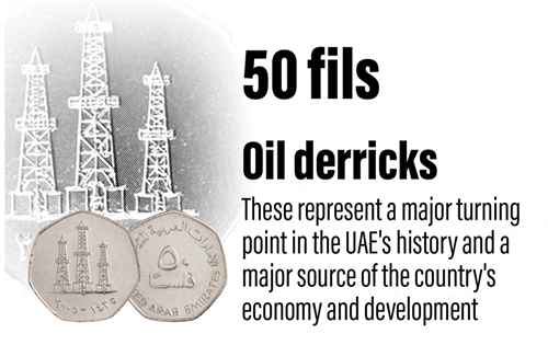 与25费尔和1迪拉姆硬币一样,50费尔采用了1973年第一次发行时的设计,以三个井架作为阿联酋发展经济的象征。