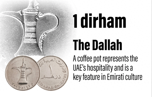 以其传统的达拉咖啡壶的设计,1迪拉姆硬币表现了阿联酋的热情好客。在1995年,它的尺寸也变小了,但是有的时候你也会遇到1995年之前的版本。