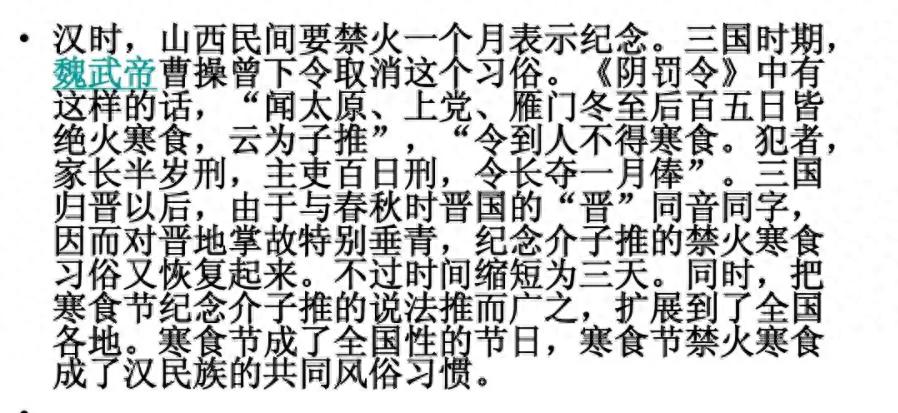 在焚烧山林的时候,正好是三月五日清明时节。晋国人都是仰慕纪念介子推,因为他是被火烧死的,所有不忍心再点火,不烧火做饭,为他吃冷的食物一个月。后面慢慢地减到了三天。