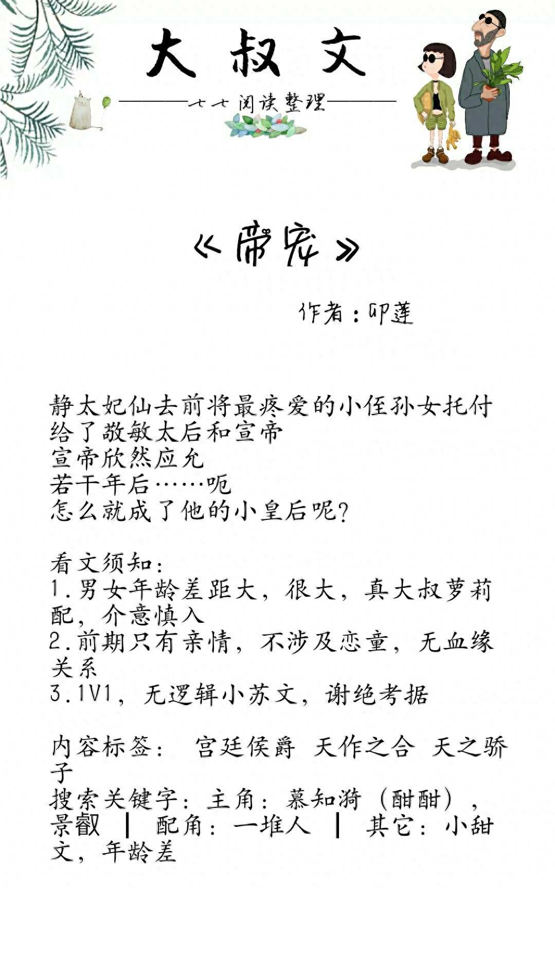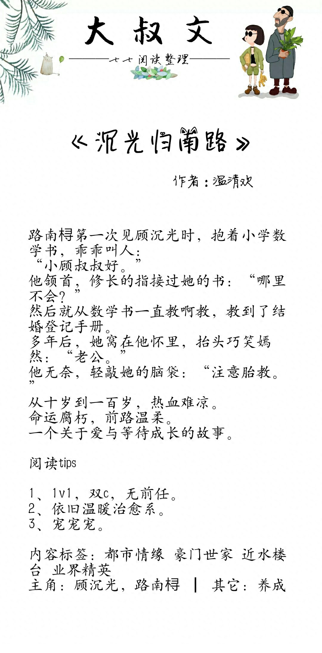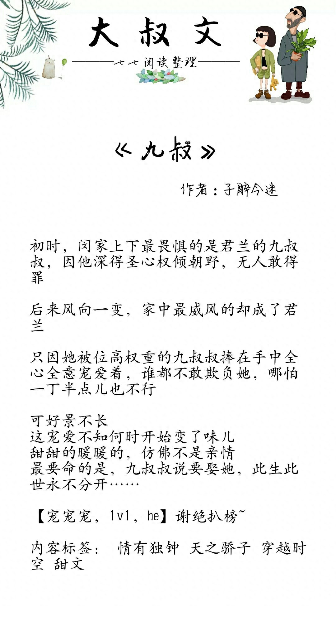 Ps:叔宠养成文,女主因为父母辈的关系,身世挺可怜的,在很小的时候就认识了男主,经常去找男主玩,叫男主叔叔。男主温柔型,对女主超好超好,一直都很宠女主,深情又专一,男主爸妈也很喜欢女主。感觉小说大部分的雷都在女主父母那一辈身上,男女主之间很甜,温馨治愈,文中有一个女主青梅竹马的深情男配,不过后面就没出现了