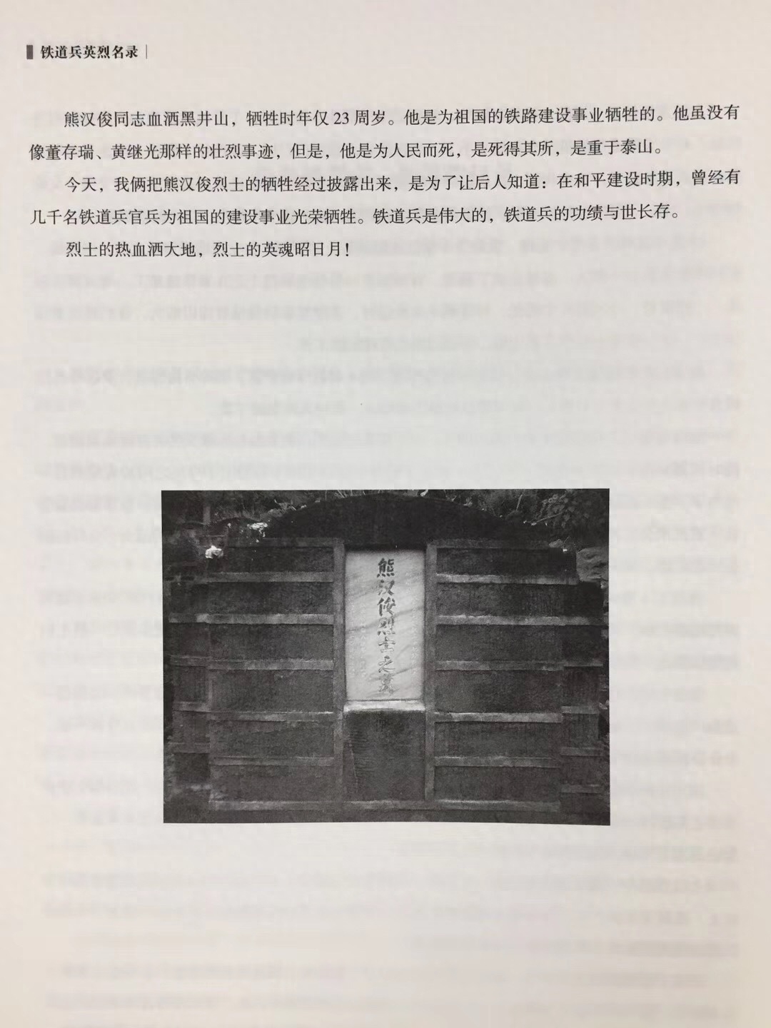 熊汉俊烈士确有其人,他是江西人,1963年3月入伍,原系铁八师36团17连4排13班班长。1966年8月24日,在黑井隧道施工中,因排架倒塌,被砸中不幸牺牲,年仅23岁。遗体葬于黑井烈士陵园。以下是他的战友的回忆: