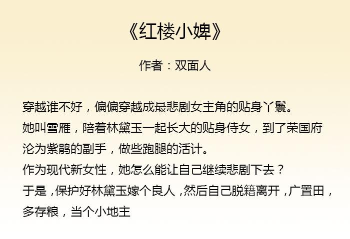 今天为大家推荐三本重生到红楼梦的故事,作者都是双面人。最先看的是《红楼小婢》,哇,这本真的特别的好,故事非常的吸引人,熬夜在看,看完后还不过瘾,于是找了作者其他的作品也就是另两部《红楼之黛玉为妻》和《红楼之林如海重生》,这两本也很好看,故事好文笔也好,非常值得一看。