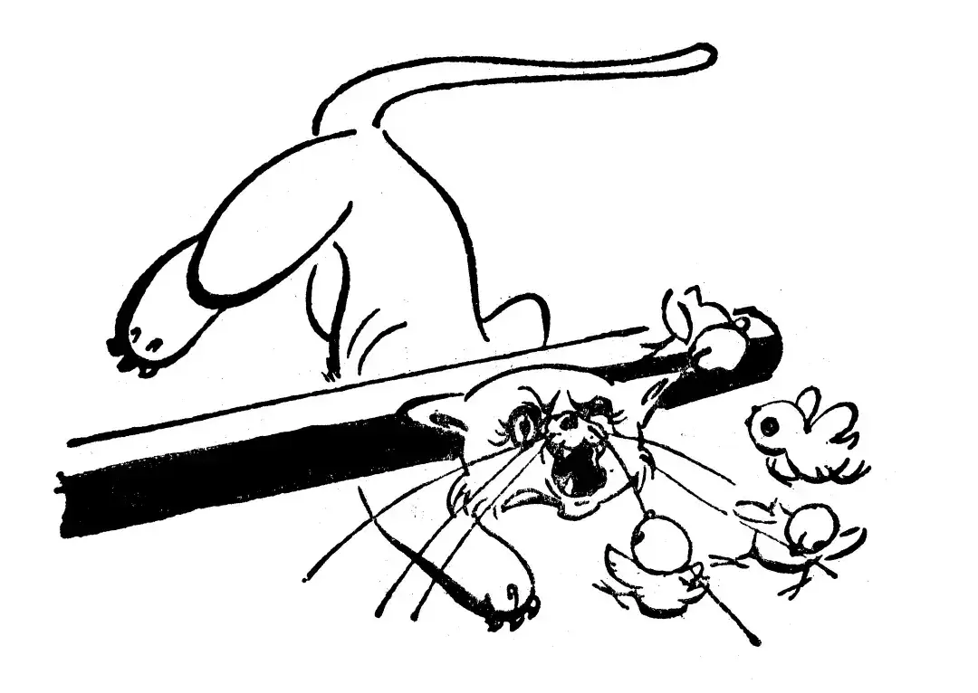 这时,门上的棒槌照准野猫的肚子狠狠打下来,又紧紧地压住他,不让他逃跑。然后小鸡们立刻蜂拥而上,你一啄、我一抓,不一会儿工夫,就把野猫撕了个稀烂。