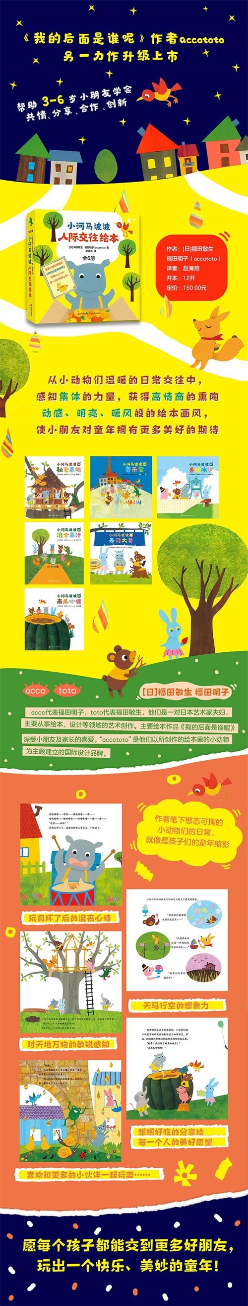 [日]福田敏生、福田明子(accototo)acco代表福田明子,toto代表福田敏生,他们是一对日本艺术家夫妇,主要从事绘本、设计等领域的艺术创作。主要绘本作品《我的后面是谁呢》深受小朋友及家长的喜爱。“accototo”是他们以所创作的绘本里的小动物为主题建立的国际设计品牌。accototo的绘画风格充满动感、温情,暖风般温和明亮的色彩是作者对孩子们童年的期待。