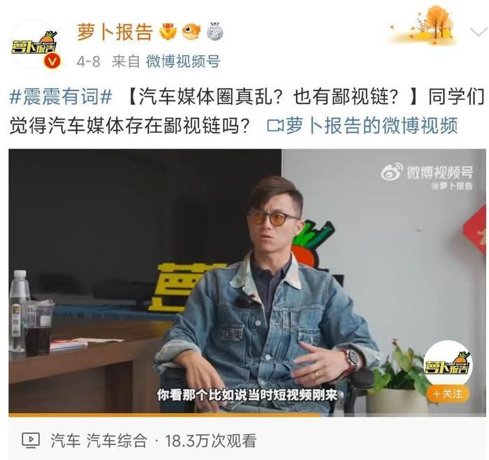 在微博上做视频,@陈震同学是先来者。2014年创立《萝卜报告》以后,@陈震同学便开始在微博上更新汽车视频内容,评测新车、知识科普,《萝卜报告》在长视频平台同步更新,但通过微博的强大影响力,其品牌价值日渐攀升。
