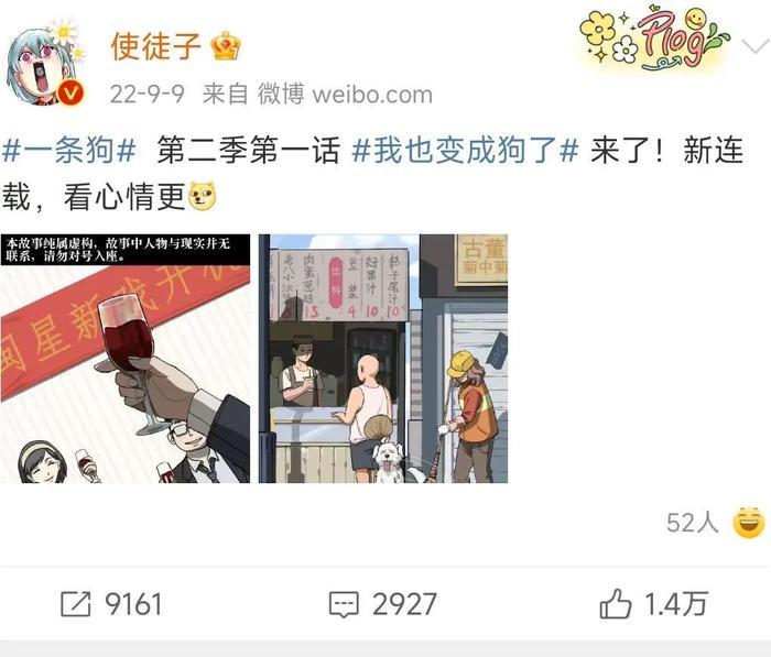 2014年,他的条漫《一条狗》开始在微博连载,随即爆红,@使徒子开始被全网所熟知。他将自己的爆红归结为“时代红利”。“在2015、2016年,微博漫画内容非常兴盛,大家都在卷,微博的社交属性在当时也是无可匹敌的,所以在动漫领域的影响力非常大。”