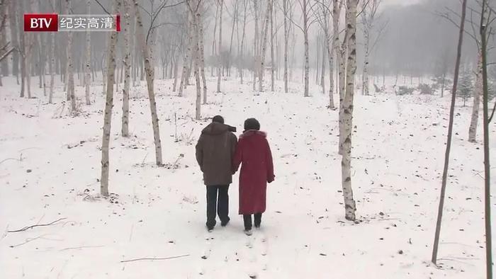 金婚庆典结束后,已身患癌症的文丽,一身大红羽绒服,与佟志互相牵挽,走进茫茫雪地里。