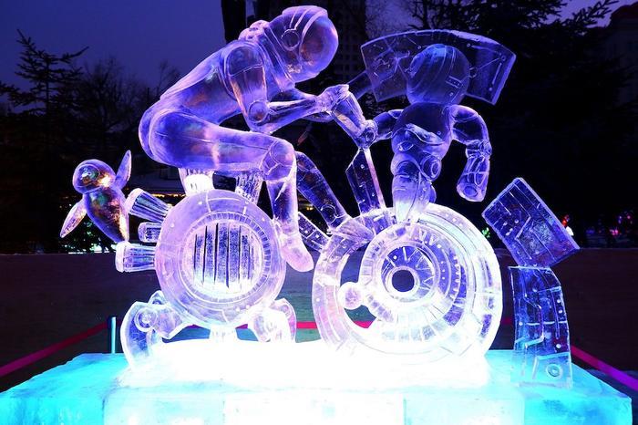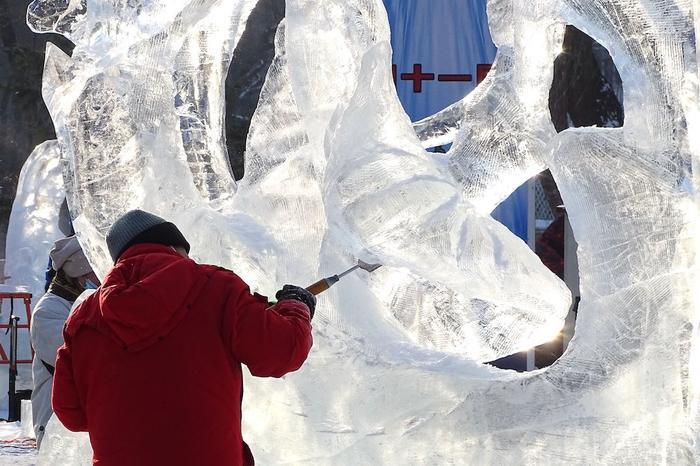 为了进一步扩大知名度,冰雪节创立不久后,哈尔滨又开始举办国际冰雕比赛,邀请了许多外国代表队来参赛。有意思的是,冰雕在当时的国际上来说也是一门小众的艺术。来的很多参赛者都不是专业的冰雕设计师,有的是做木雕的,有的是搞石雕的,还有做工艺美术的,什么都有,因此来了以后,很多冰雕工具他们也不会用。而且那时候做冰雕,不像现在有电动工具,都得靠手来一点点切,一点点凿,于是我们这些现役的冰灯工作人员就被派去帮忙做助手。我当时分配到了美国代表队,那也是我第一次参赛。