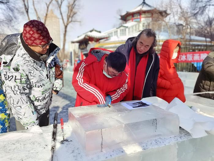 而且和大型冰雕不同,冰版画可以真正地保存下来。如今,每年兆麟公园冰灯游园会期间,我们也会举行冰版画比赛活动,让大家接触和认识这门艺术。
