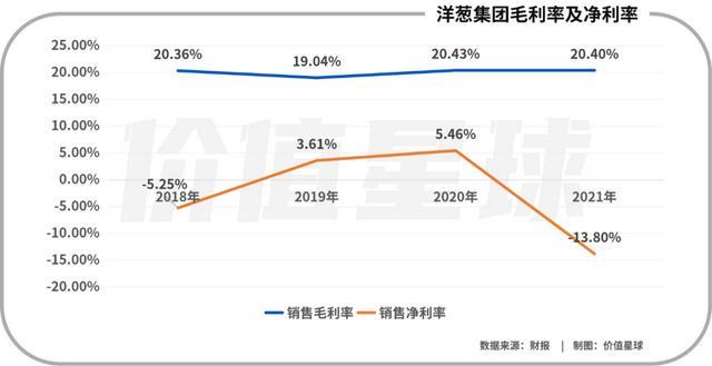财报显示,洋葱集团过去三年的毛利率基本稳定在20%左右,但是净利率则从2019年的3.61%降到了2021年的-13.80%。