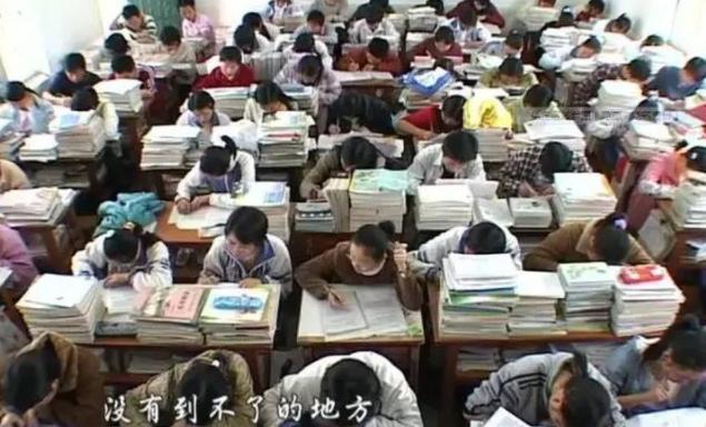 早上5点30起床,一直到晚上9点50分,每周只有周日可以休息半天;6点早自习开始,教室里就有读书声了,背政治的、背语文的、背历史的、背英文的,不同的声音融合在一起,像一首宏大的交响乐;每个学生的课桌上,都堆着厚厚的卷子和课本,低着头几乎看不到人影。手头的试卷一天比一天多,每张课桌边都有几枚钉子,上面挂满了试卷。