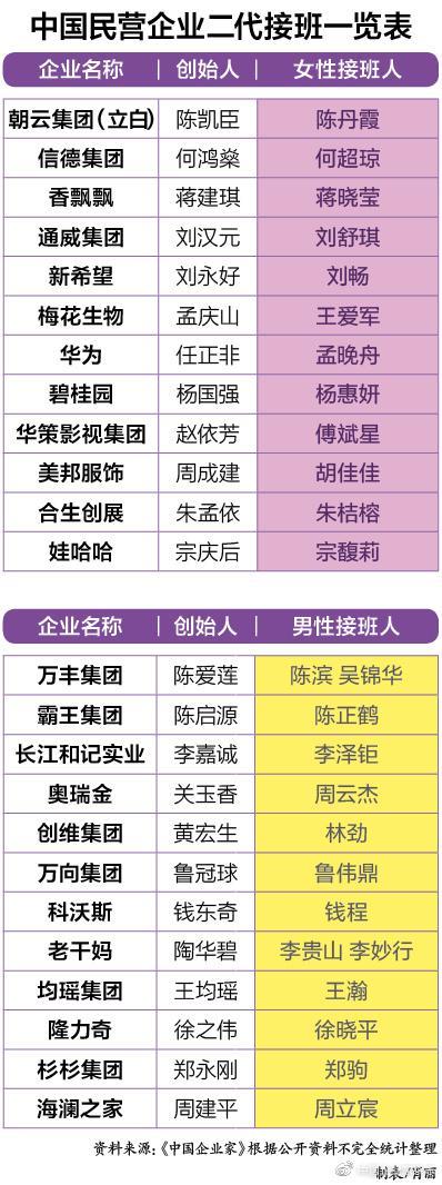当然,别忘了合生创展的创始人朱孟依,他没有把公司交给儿子朱一航,而是交给了女儿朱桔榕;2016年,美邦服饰董事长、总裁周成建“裸辞”后,也将权杖交给了当时30岁的女儿胡佳佳;2019年5月,山东前首富、魏桥集团创始人张士平去世,前一年他完成了交接班,大女儿张红霞执掌纺织业务,儿子张波接管铝业板块,另一个女儿张艳红则分管工业园。