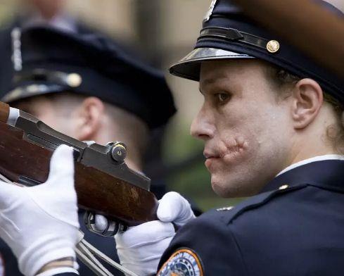 6.小丑的妆容。小丑在电影中最有名的台词就是,他会靠近一个人并说:想知道我是如何得到这些伤疤的?有趣的是,诺兰一开始并没有在剧本中在小丑脸上留下疤痕,而希斯莱杰在演出时则会把舌头顶在嘴巴里的其中一侧,让这些疤痕看起来是肿肿的。