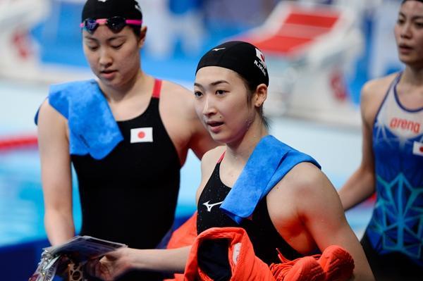 池江璃花子(前)完成女子4×100米自由泳接力预赛。IC photo供图,请勿转载