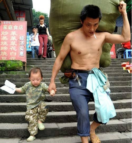 一位父亲肩上扛着200多斤的货物,一只手紧紧抓着货物的一个角,另一只手牵着小小的儿子从阶梯走下。肩上的未来,嘴里的过去,手里的希望,这才是男人。父亲不仅有肩扛重担的如铁硬气,也有手牵孩子的绕指柔情。