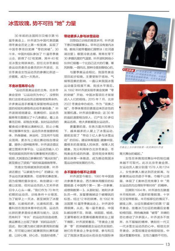 回溯到1994年,叶乔波在左膝盖半月板粉碎、大面积软骨脱落,十字交叉韧带断裂、半月板移位的情况下,披挂上阵,出征在挪威举行的第17届冬奥会,挂着冰刀出征的她最后坐着轮椅回国,用伤痛浇铸“破零”丰碑的悲壮感动了许多国人。叶乔波永不放弃、永不服输的精神,镌刻在一代又一代冰雪女运动员的心中。相信北京冬奥会,冰雪玫瑰定会绚丽绽放。中国冰雪蓄势待发,女性力量势不可挡。