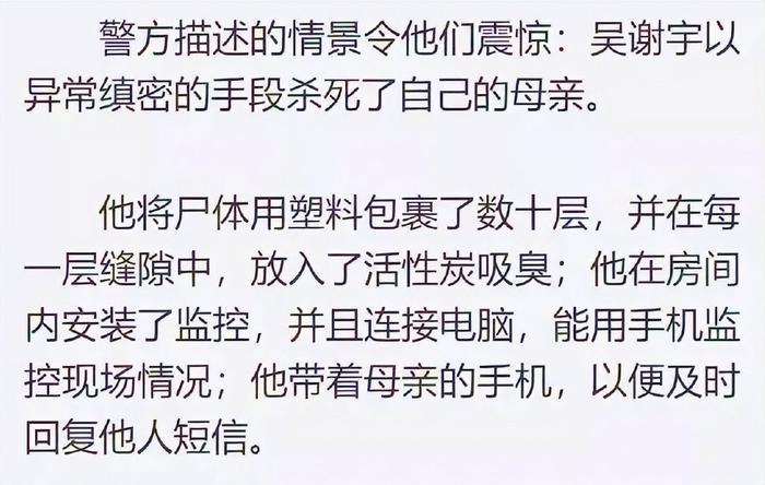 其二是冷血凶残,杀了自己亲娘之后,冷静的包裹冷冻尸体,谎称母亲出国陪读,如果谢天琴方面的亲属没有发现端倪,说不定吴谢宇会一直逍遥法外,真的出国去了……