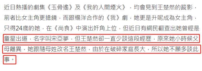 《人间烟火》播出期间,就有媒体翻出了王楚然家庭背景,提到她本名宋亚梦,因为父母离异跟着妈妈生活,就随母姓改名王楚然,可能因为童年伤痛,王楚然本人鲜少提及这段过往。