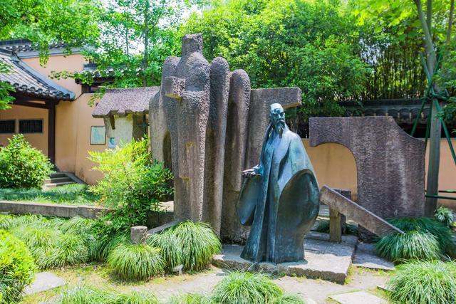 青色的雕塑相当符合其精神气质,陆游右手握笔,神情悲怆,宽衣大袍显出诗人的清瘦。作为南宋爱国诗人,陆游痛心山河破碎,忧国忧民,其一生词作也主要着墨于爱国情怀,抒发壮志未酬的幽愤。