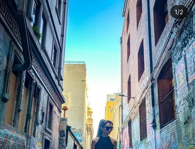五颜六色的街道,面对夕阳的余晖,昆凌手里拿着咖啡走在街上。黑色背心搭配完美的直角肩和漂亮的锁骨,搭配黑色工装裤和马丁靴,有提高身材比例的效果。然后她扎了个高高的马尾辫,戴上墨镜,走在路上。她是个很酷的女孩。难怪天王对她死心塌地。