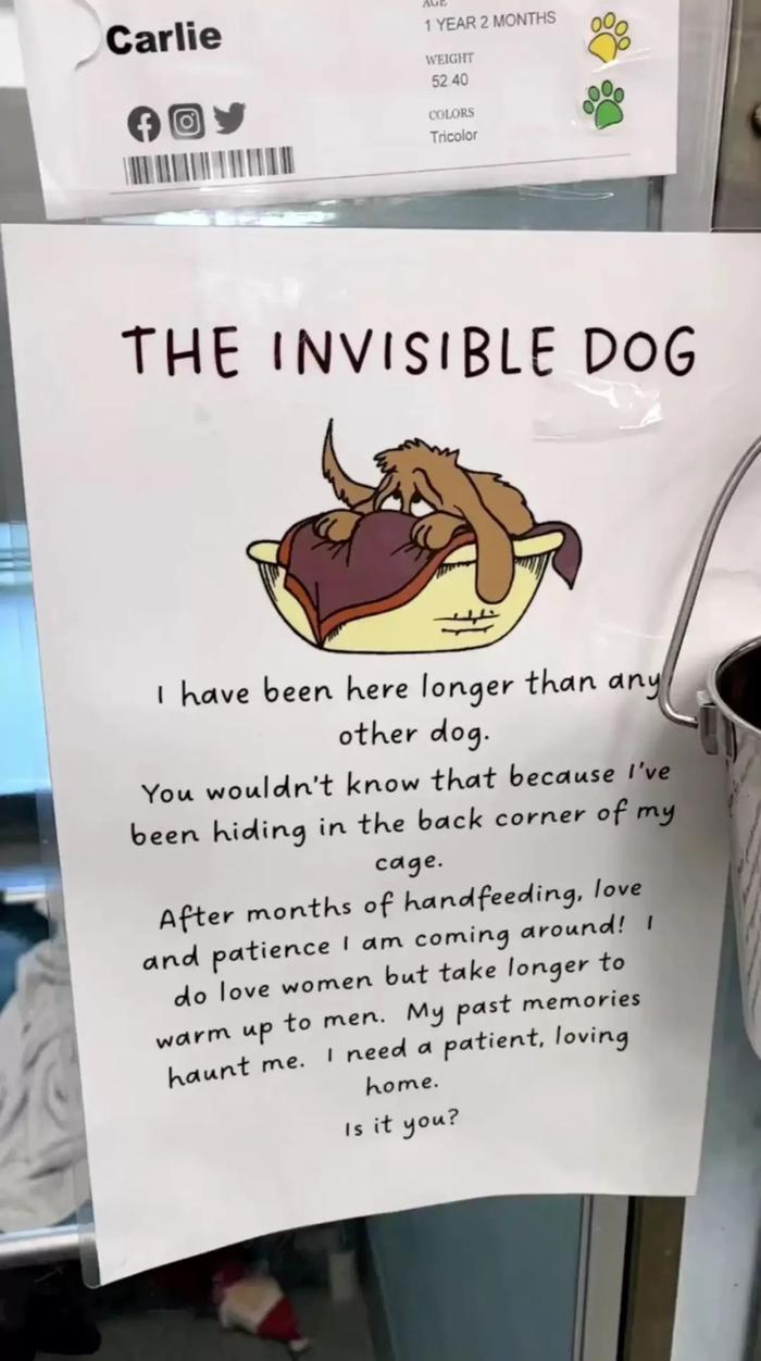 “我是一只隐形狗,我在这里的时间,比其他任何狗狗都要长,你看不到我,是因为我一直躲在角落里。