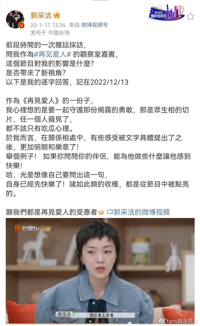 本期节目中,郭采洁身穿拼接牛仔外套,搭配黑白条纹撞色半裙,沉稳大气的配色加上彩色饰品点缀,整个人休闲又复古。观察室中,嘉宾们谈及亲密关系其实是个人成长的道路,郭采洁表示“我们都会认为能够来到这个节目的嘉宾是真的非常勇敢的。因为在这里他得去揭露自己一个正在面对的问题,所以其实我们都是受惠者。我们透过他们的伤痛,来去看见可能在自己身上的一种可能性。所以节目真正要带出的,其实不是大众的一个情绪宣泄的出口,而是让我们大家都真的把自己的日子能够过得更好。”其中满含着郭采洁自身对于节目呈现出的故事背后深刻的思考与理解。节目播出后,郭采洁也在社交平台分享《再见爱人》节目对她的影响“于我而言,在关系相处中,有些感受被文字具体提出了之后,更加明朗和乐意了!”“诸如此类的收获,都是从节目中被点亮的。”字里行间中看出郭采洁以人为镜,透过嘉宾的故事总结自己的生活,在矛盾中思考,在问题里成长。