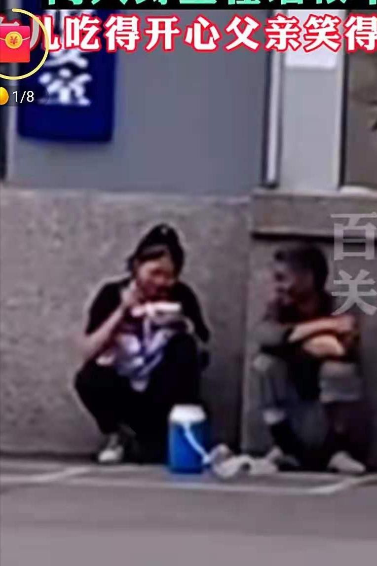 6月5日,河南驻马店,一位衣衫褴褛,背影佝偻,被晒的像炭一样面容的父亲,中午来给门口给女儿送饭,俩人蹲坐在墙根下,女儿吃的开心,父亲笑的温暖。