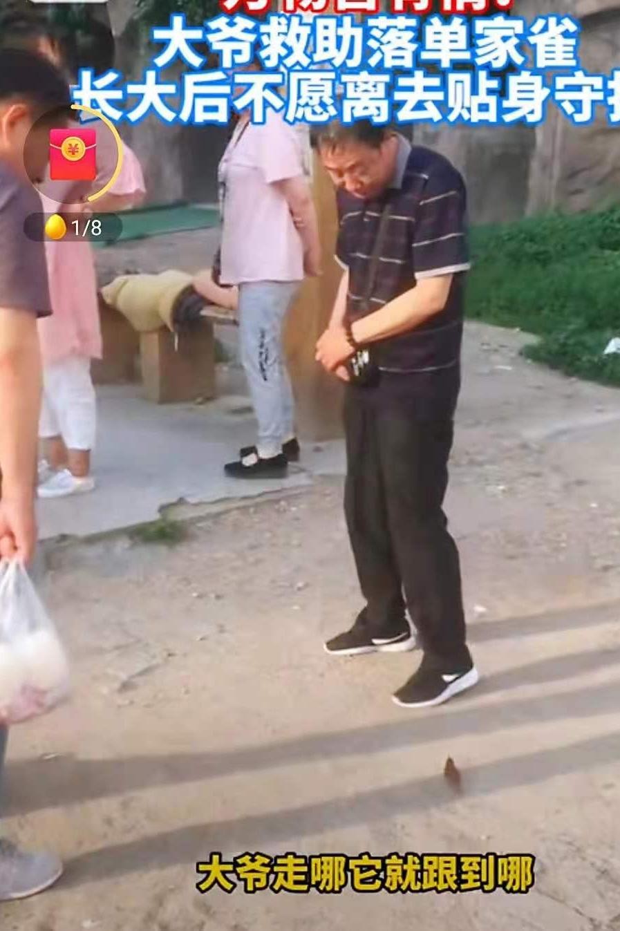 6月9日,辽宁本溪,一位大爷曾救助一只幼小落单家雀,然后从小把它养大,家雀长大后不愿离去,贴身守护,大爷走哪跟哪,大爷撑手说让它飞上来,小家雀就飞他手上去了,可听话了。