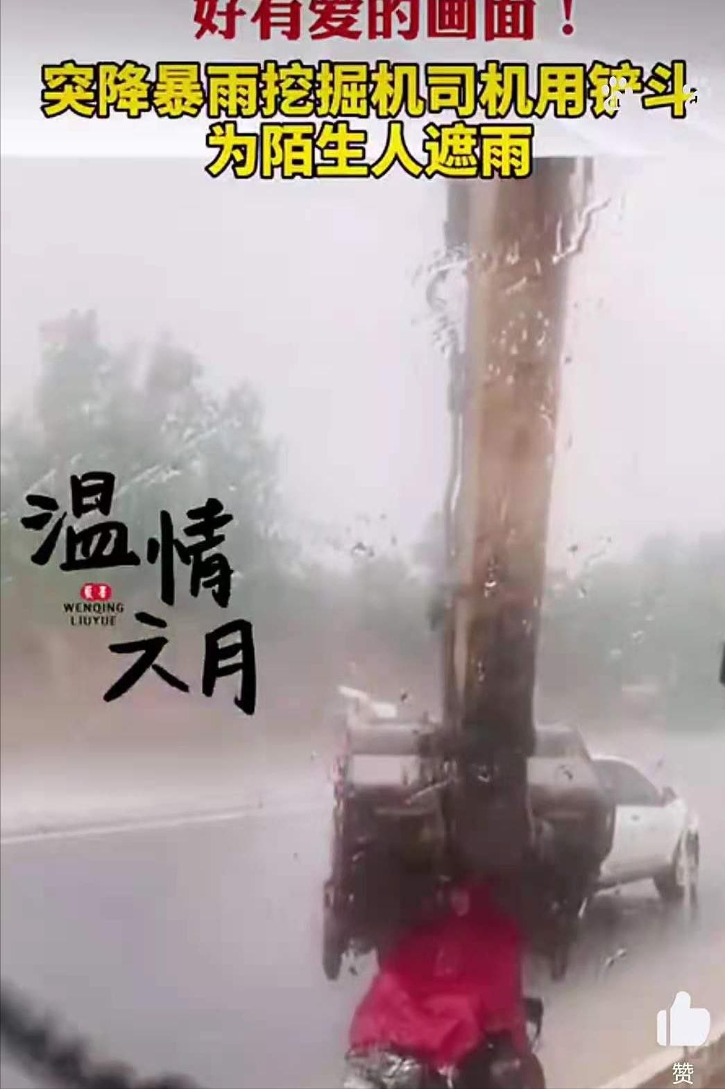 6月9日,山东泰安,一大叔骑电动车突遇暴雨,淋得眼睛都睁不开的时候,路边一90后挖掘机司机邀请其到副驾驶座避雨遭拒后,用铲斗为其挡雨40多分钟。