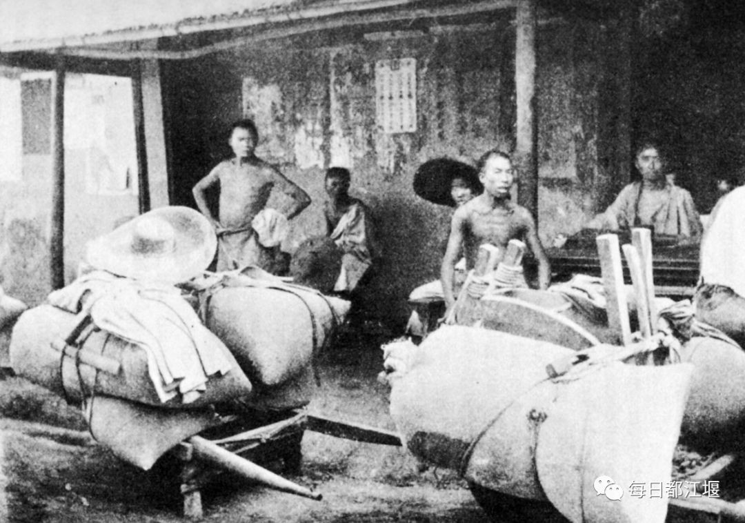 1898年川西平原上的鸡公车,伊莎贝拉·伯德(英国)摄。鸡公车由于独轮的机动灵活,适应平原地区各种路况,深受川西地区农民的欢迎,1949年前灌县约有8万辆。都江堰市档案馆供图
