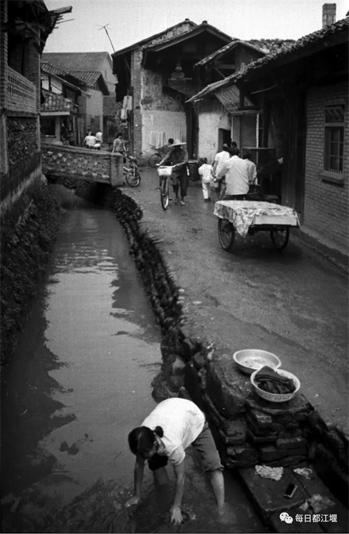 1984年,五桂桥街 ,清代为马桑河古道,是都江堰内江小支流杨柳河的泄洪河道。民国初,马桑河废弃不用,河道填平,逐渐变为街道,以原马桑河上的五桂桥作街名。都江堰市档案馆供图。