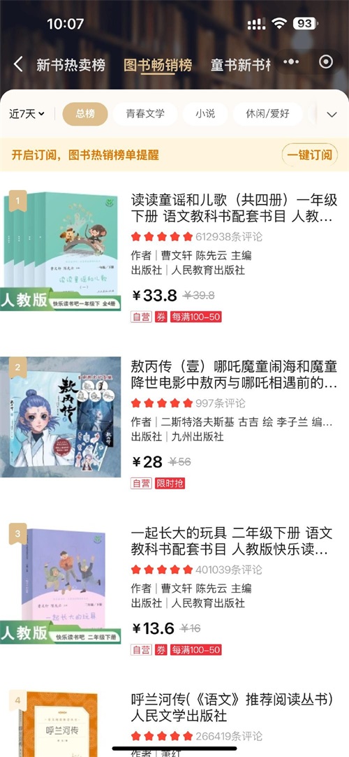 2月22日,记者在当当网上看到,位于图书畅销榜总榜第一名的图书,就是跟哪吒电影相关的《敖丙传》。2月24日时,该书还位列总榜第二名。书评中,很多家长留言表示孩子很喜欢。在京东网的图书销量榜上,一本名为《哪吒 三界往事》的官方原创番外绘本也位列本周周榜榜首。