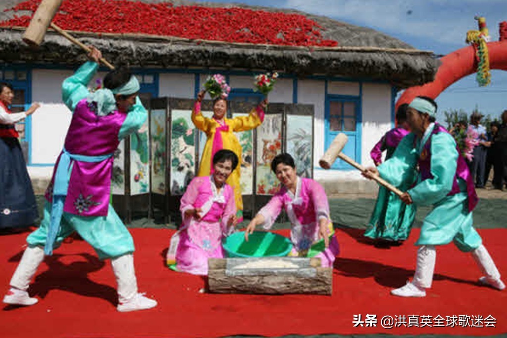 先简单科普下什么是“打糕”?“打糕”是朝鲜半岛上的韩国与朝鲜两国人民以及从朝鲜半岛迁徙到中国东北三省的朝鲜族的传统食品,旧时农历三月祭祀时以之供神;用糯米或黄米以水淘洗净,晾凉后将糯米煮成的饭盛于木槽或石槽内,用木榔头蘸水,反复倒杵形,抻拉形成糜状,然后倾倒事先备好的石板上,再以木榔头蘸水将其打成面饼;边打边拨,使其厚薄均匀。第一次打出的叫“擦台糕”,一般不用作供神;第二次以后打出因石板面已干净方可食用。做打糕绝对是个体力活儿,没点臂力和坚强的意志力基本打几下就累趴下了,而这时朝鲜族能歌善舞的特点就派上用场了,周边的亲朋邻里会用有节奏的号子和载歌载舞的方式增加节日欢快的氛围,同时也鼓舞正在槌打米糕的人坚持下去,不要泄劲。这样出来的“打糕”才糯软粘柔,芳香浓郁。