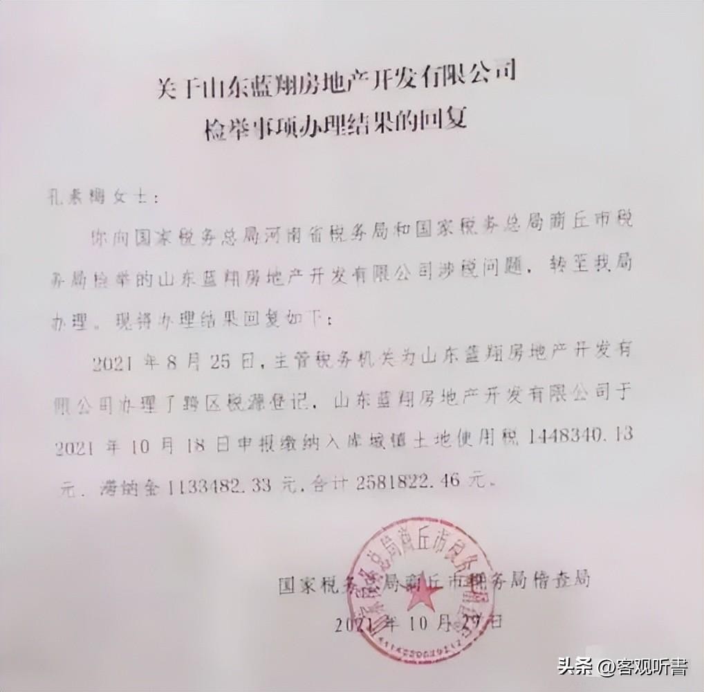 于是,孔素英开始反击,实名举报蓝翔地产天伦花园项目涉嫌逃税。经过调查,这一举报被证实属实。看来,