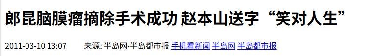《郎昆脑膜瘤摘除手术成功 赵本山送字“笑对人生”》半岛网