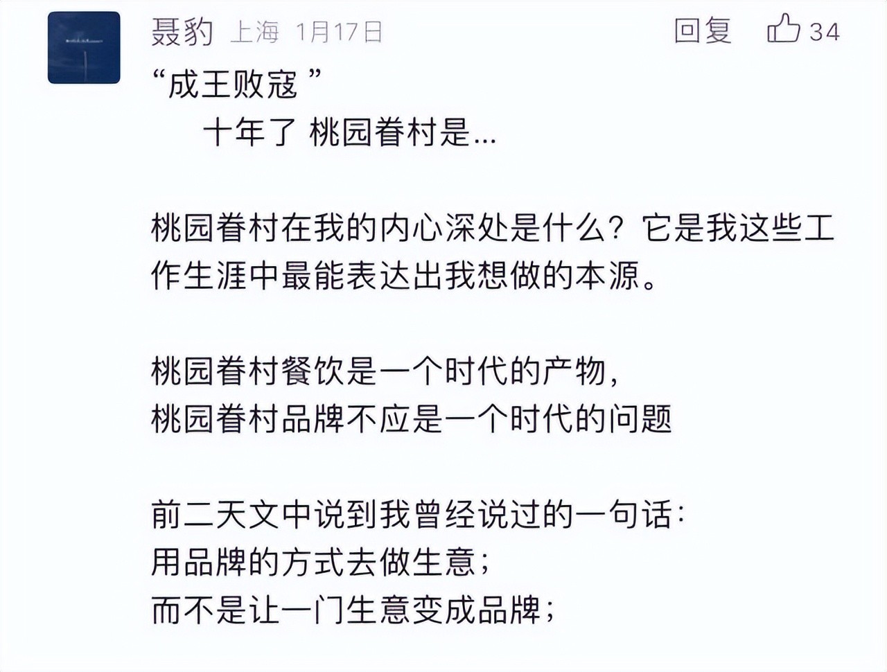 这一传闻在网络上引起了轩然大波,十天后,桃园眷村的官方公众号发表了一篇《我们的十年》的文章,似乎在回应外界的质疑。文章中说:“人生总是有起有落,我们身在时代的浪潮中,很多事情确实身不由己”。这也暗示了,这家曾经风光无限的“高端中式早餐”,正面临着前所未有的危机。