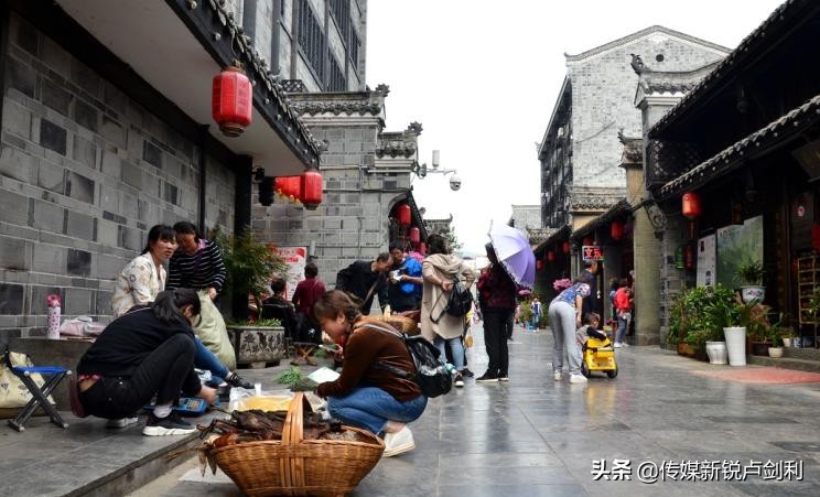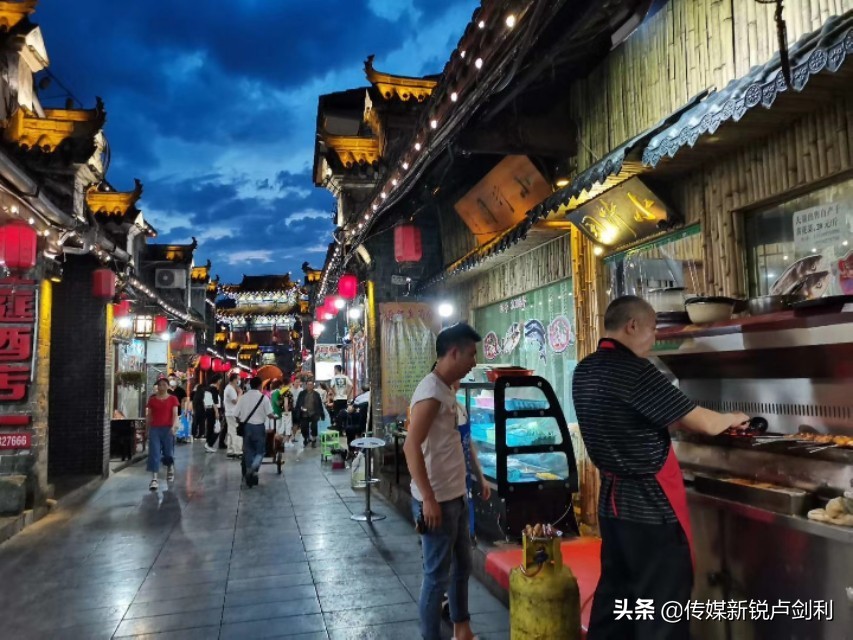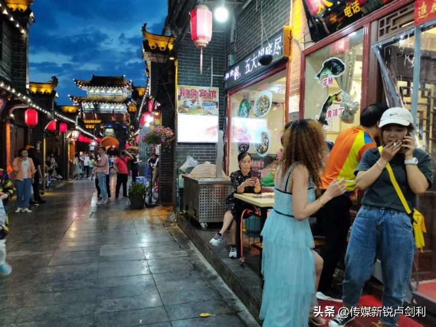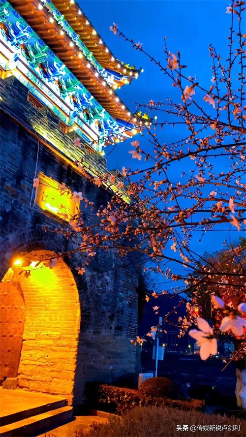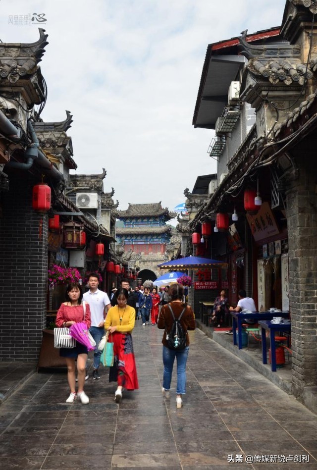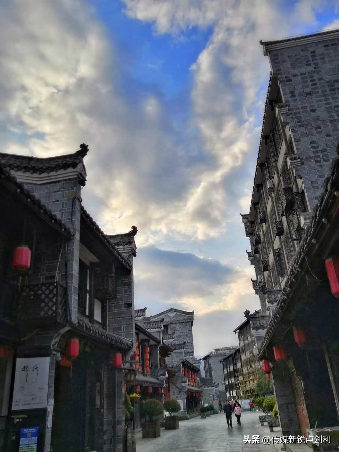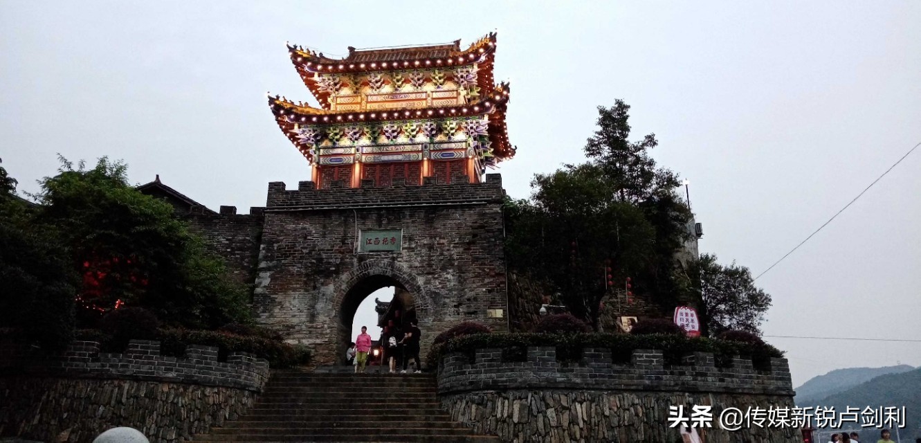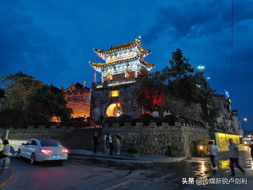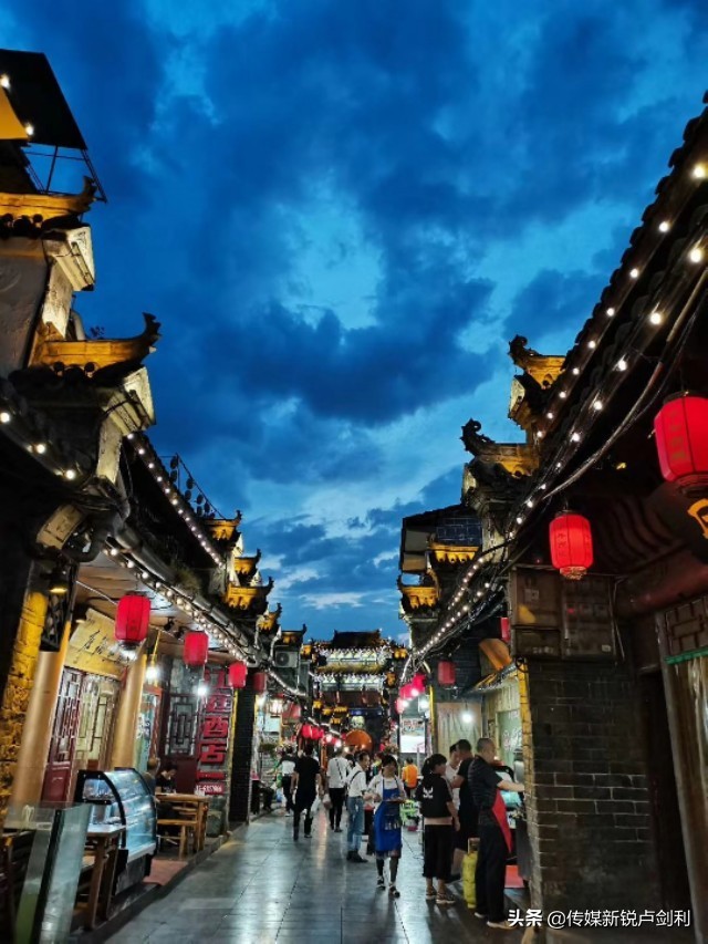 每当夜晚来临,灿烂的霓虹象巧夺天工的画匠,将东西两座城垛以及其上三层八角吊楼的轮廓清晰地勾勒出来,俏生生地左顾右盼,眼波流转。家家户户门前的红灯笼摇曳生姿,古朴雅致的白色四方灯穿插其中,“俭、容、和、诚”等篆文以及诸多诗词点缀其上,陡增些许文化气息。古镇、古街、古屋、古灯、古词,置身其中,恍惚间,仿若穿越时空……
