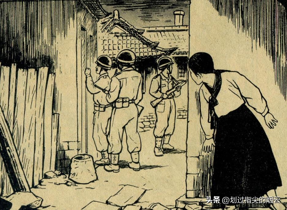 她颤抖抖地走到纸窗跟前,从纸窗的破洞口向外窥看。只见在黑暗的街道上,有三个端着美国枪穿着美国军服的人,押着一个被捕的人走过。
